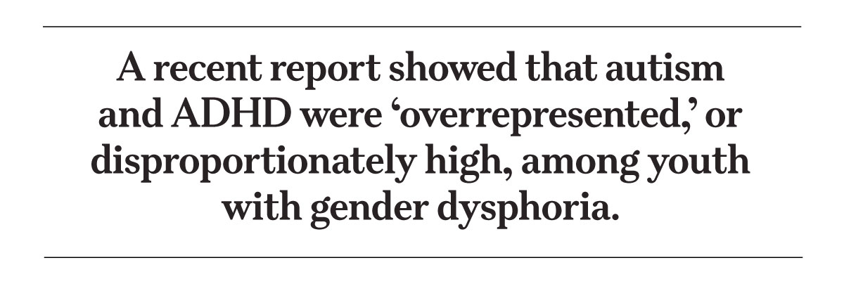 A report published this month by the British think tank Centre for Social Justice showed that autism and ADHD were “overrepresented,” or disproportionately high, among youth with gender dysphoria.