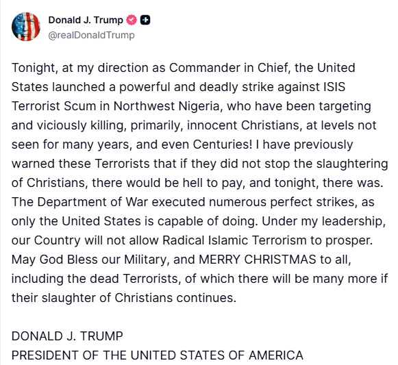“The Department of War executed numerous perfect strikes, as only the United States is capable of doing. Under my leadership, our Country will not allow Radical Islamic Terrorism to prosper. May God Bless our Military, and MERRY CHRISTMAS to all, including the dead Terrorists, of which there will be many more if their slaughter of Christians continues.”